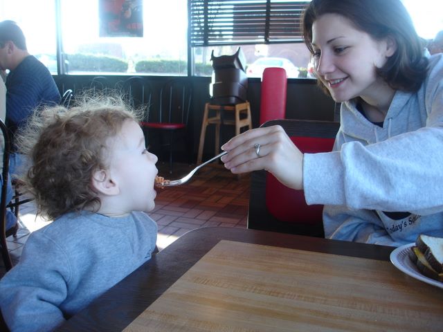 Christmas 2007 -- Pierce's first bite of Waffle House food ever!